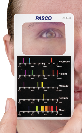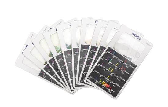 This set of 10 diffraction gratings are mounted on stiff cardboard and have printed sample spectra. This allows students to identify the gas in a spectral tube by comparing the spectral lines they see through the grating to the printed spectral chart. The printed spectra include hydrogen, helium, mercury, sodium, and neon.
